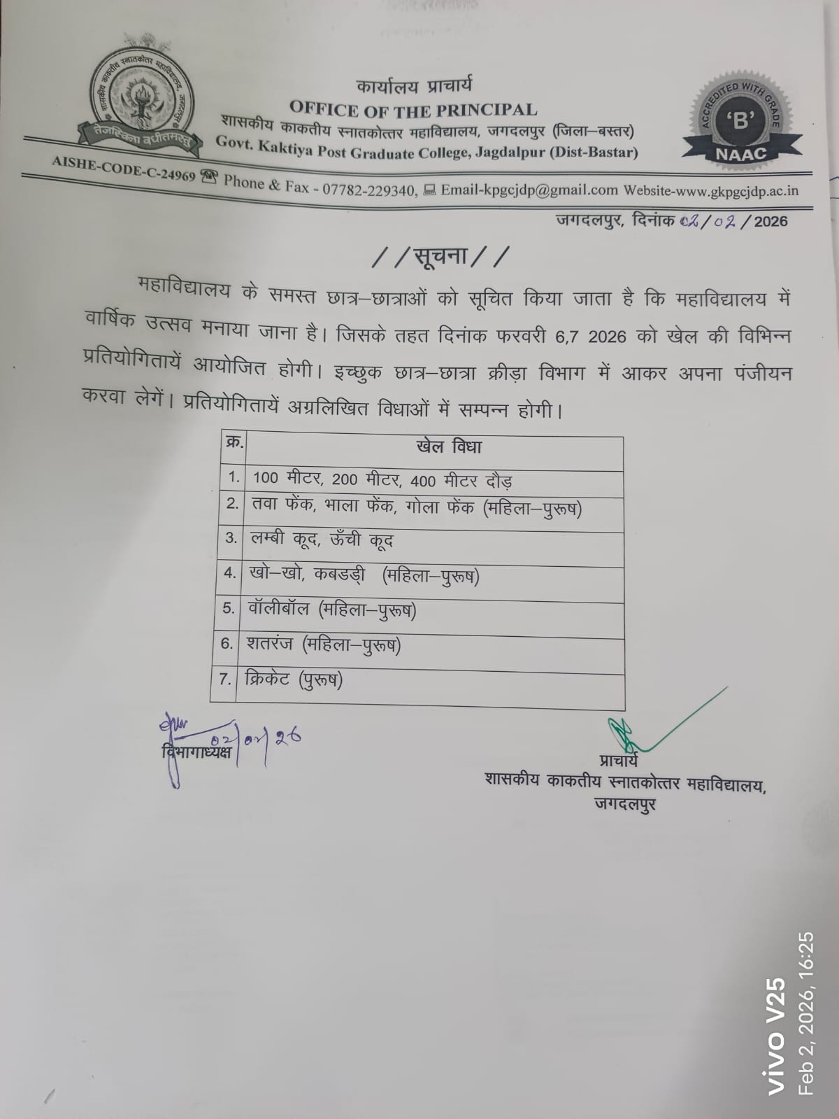Government Kaktiya Post Graduate College, established in the year 1960, is a distinguished institution of higher education located in the heart of Bastar, Chhattisgarh. The college is affiliated with a strong commitment to national values and educational reform and it has realigned its academic goals in accordance with the National Education Policy (NEP) 2020. With a clear focus on holistic, multidisciplinary, and skill-based learning, Government Kaktiya PG College has become a center of opportunity for students aspiring to excel in various academic and professional fields. The college offers a wide range of programs in Arts, Science, Commerce, and Law, with postgraduate and research options in selected subjects. The institution is NAAC accredited with a “B” grade, reflecting its steady growth, commitment to quality, and efforts toward continuous academic improvement. With an intake capacity of around 3000 students, the college serves a large and diverse student population from tribal and non-tribal regions alike.